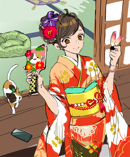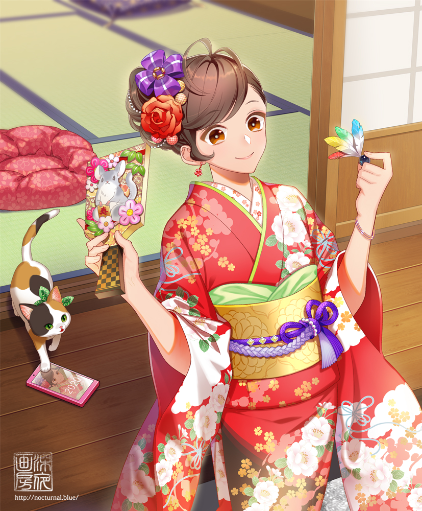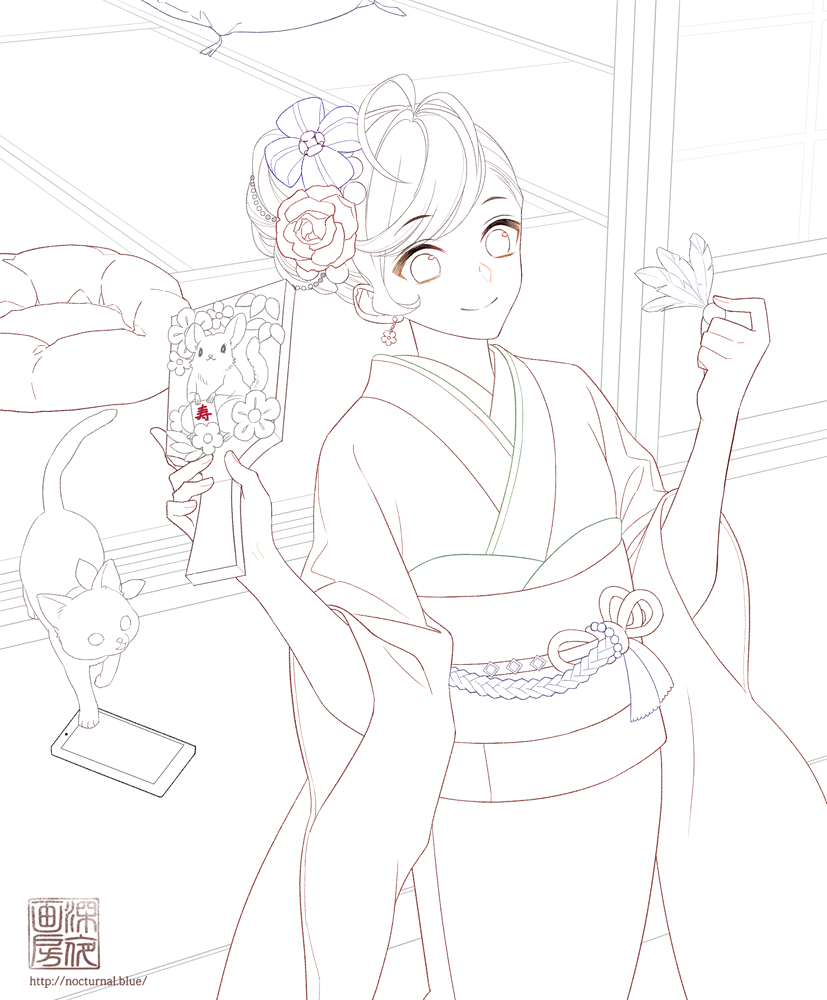 SAI2 背景とキャラクター(人と動物と小物)の入ったイラストを想定して制作 子年なので羽子板のキャラモチーフは鼠…ではなくチンチラです笑